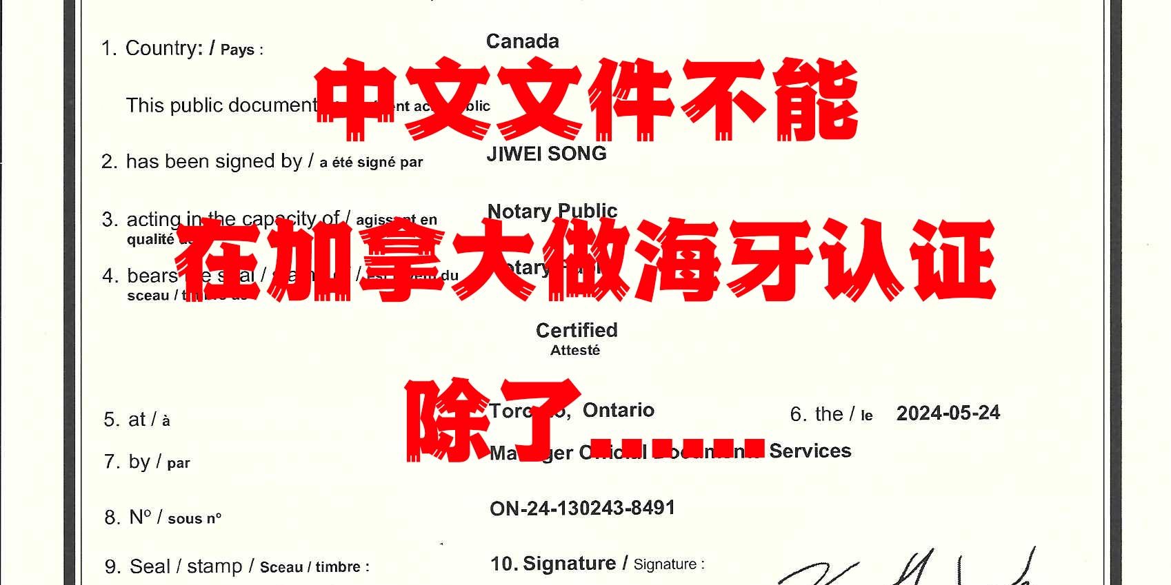 根据安省政府的规定,在加拿大是不能做中文文件的海牙认证的(比如说各种中文证件类,但这些文件如果应用在加拿大境内的话,我们是可以做翻译公证的),但有一个情况除外,就是在中文的文件上签字的文件,是可以在加拿大做海牙认证的。