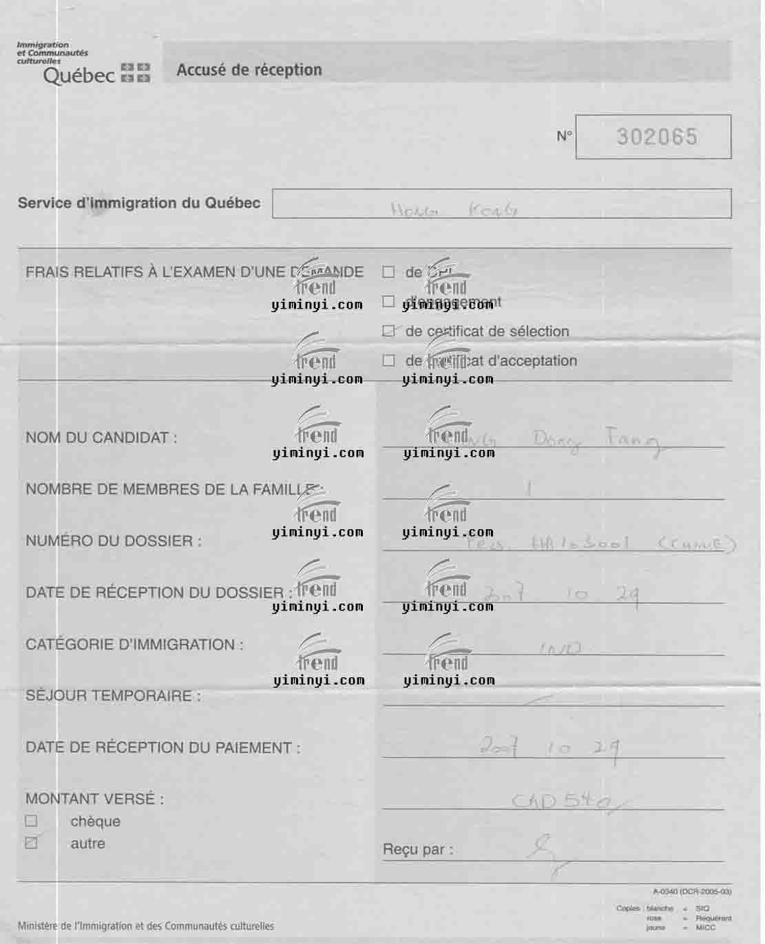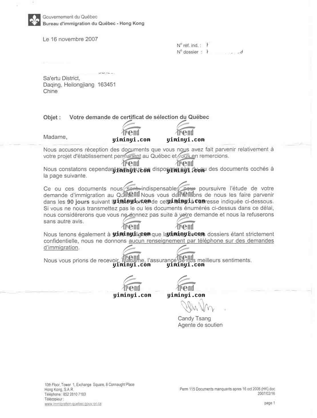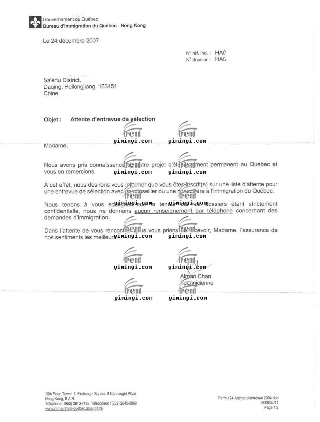 唐女士,1975年出生,大学教育背景,在大庆某国企担任重要职务,工作背景丰富,资产来源清晰。2007年8月开始准备魁北克投资移民的文件,10月递交,11月得到补充材料通知,12月份通知面试,2008年4月在香港领事馆面试通过,得到魁省CSQ证书,然后我们帮助申请移民的签证,在2008年6月递交了完整的文件给香港领事馆,9月体检,12月得到了加拿大移民签证,2009年5月入境加拿大。在本文中提供了夫妻二人的教育背景和魁省档案号信、补料信和面试通知信。。。。。。