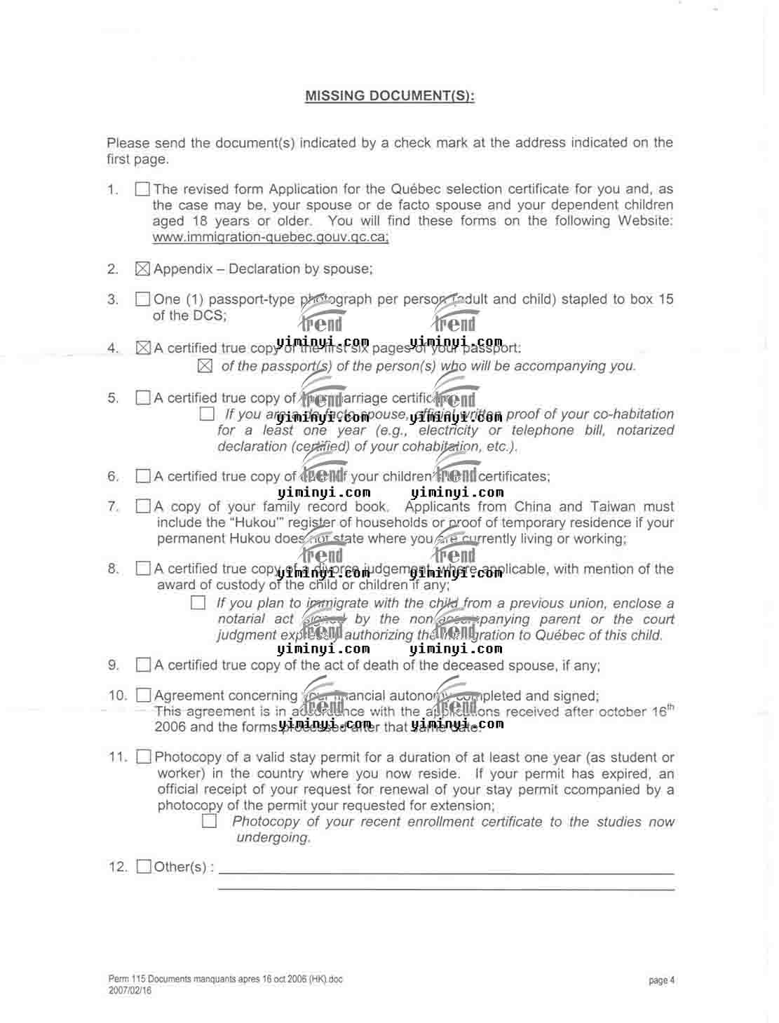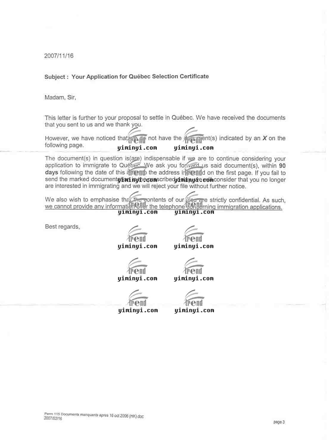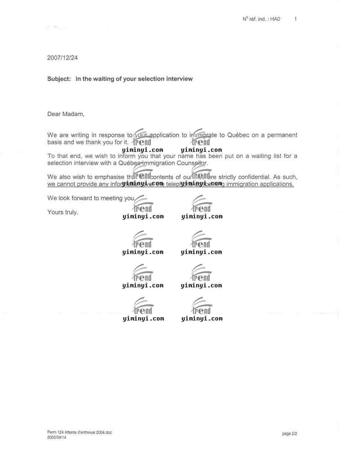 唐女士,1975年出生,大学教育背景,在大庆某国企担任重要职务,工作背景丰富,资产来源清晰。2007年8月开始准备魁北克投资移民的文件,10月递交,11月得到补充材料通知,12月份通知面试,2008年4月在香港领事馆面试通过,得到魁省CSQ证书,然后我们帮助申请移民的签证,在2008年6月递交了完整的文件给香港领事馆,9月体检,12月得到了加拿大移民签证,2009年5月入境加拿大。在本文中提供了夫妻二人的教育背景和魁省档案号信、补料信和面试通知信。。。。。。