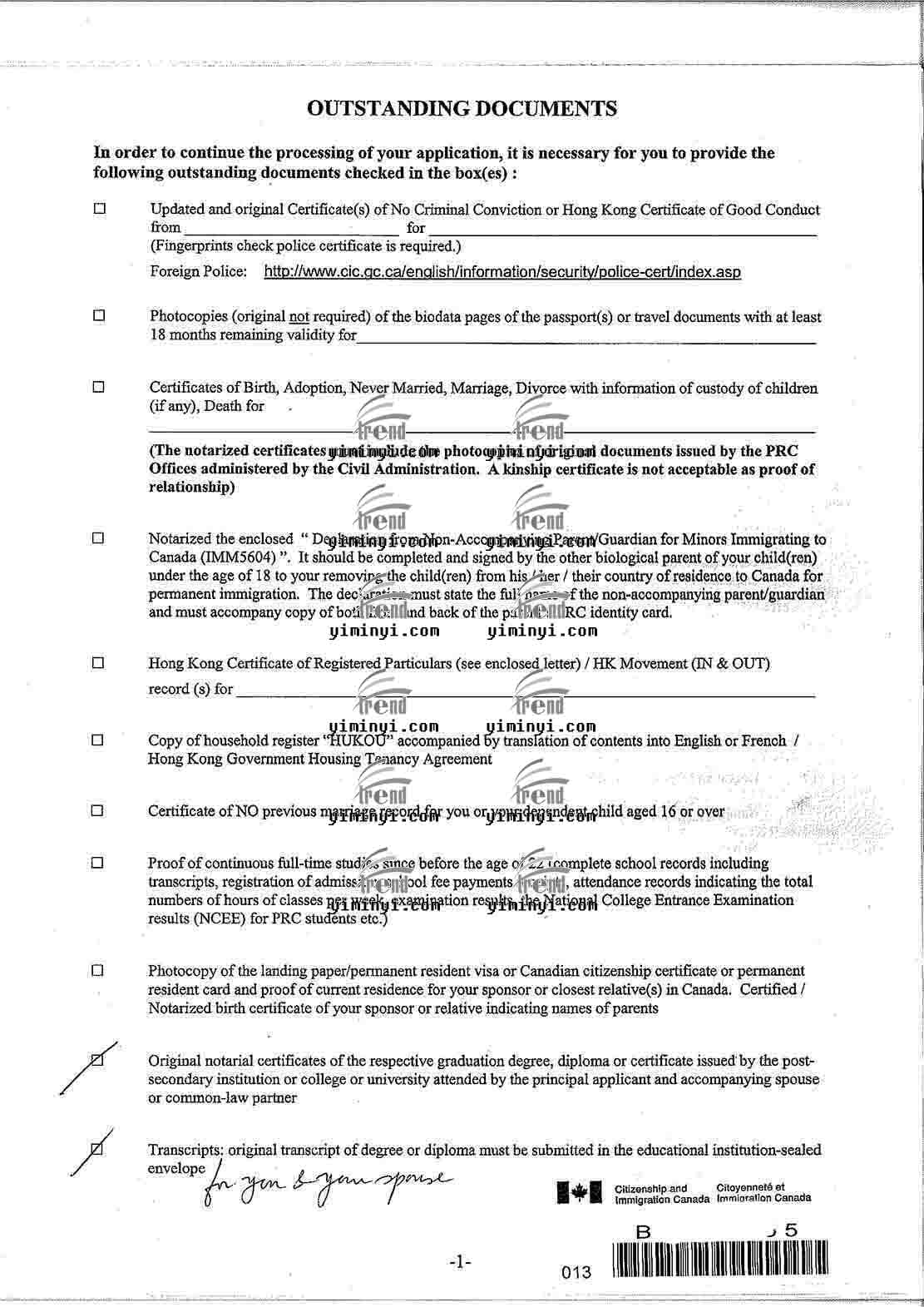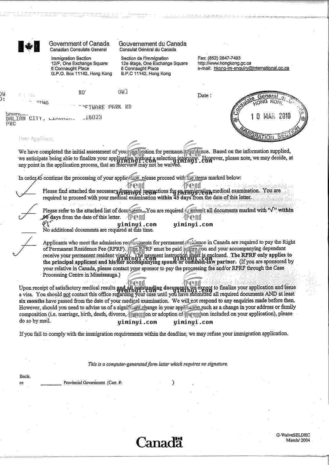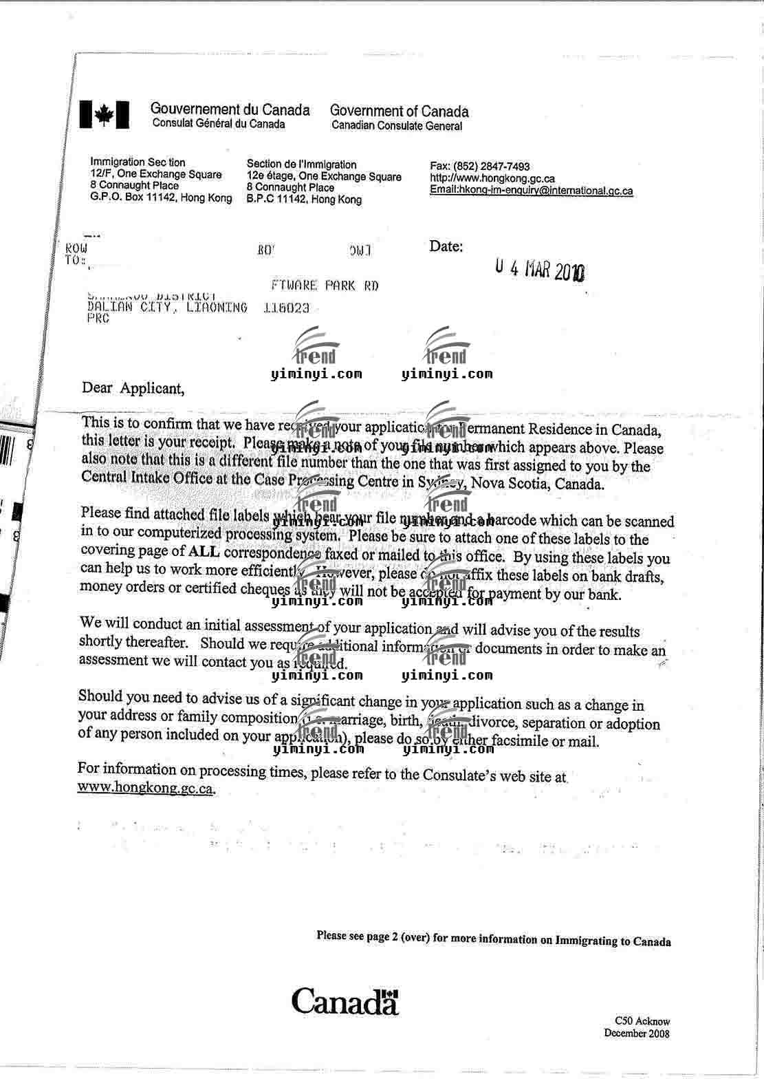 移民易出国网:加拿大联邦技术移民-使馆回复信件,杨女士和刘先生,一年申请成功。
