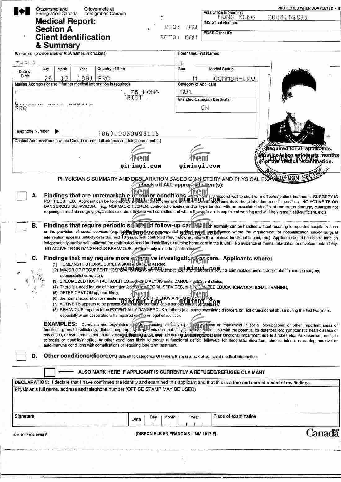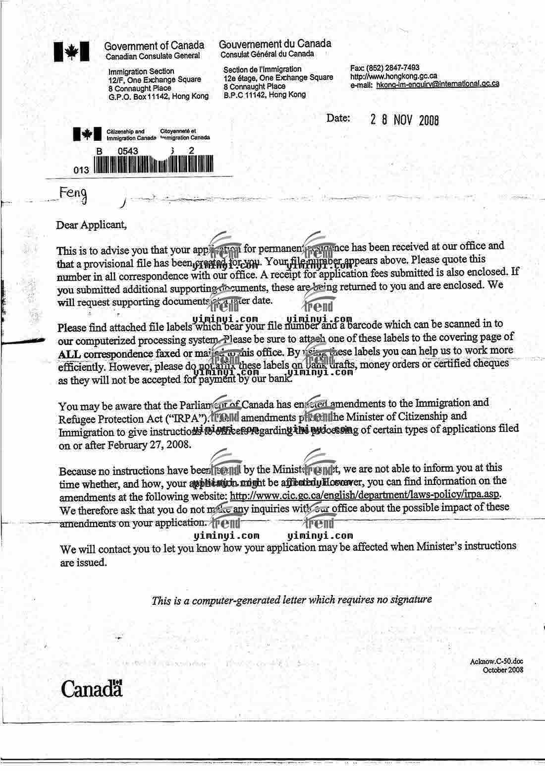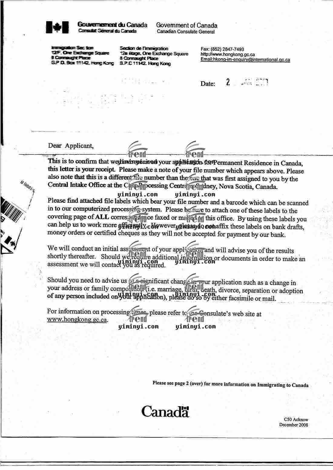 冯先生,1973年出生,与张先生是同性,一起申请移民。冯先生是山东大学国际经济专业本科,后读的澳大利亚SWINBURNE UNIVERSITY OF TECHNOLOGY并获得MBA学位。毕业之后回国,在北京某跨国公司从事财务方面的工作。2008年9月自己递交了加拿大移民申请,但由于职业定位的问题,并没有申请成功。在2009年5月委托我们再次申请加拿大联邦技术移民,我们根据当时的移民政策详细的分析,感觉职业定位需要调整,按照当时的紧缺职业递交了所有的申请,在2009年7月递交了初步申请给CIO,9月收到了档案号码,然后递交完整的文件给加拿大香港领事馆。在2011年3月收到了香港领事馆的体检表,由于副申请人的健康问题再次做了体检。2011年下半年入境加拿大,成为了加拿大永久居民。。。。。。在此文件中,有第一次没有申请成功的档案号码,第二次我们给递交的档案号码,体检表,申请人在澳洲的学历背景和未刑证明等等。