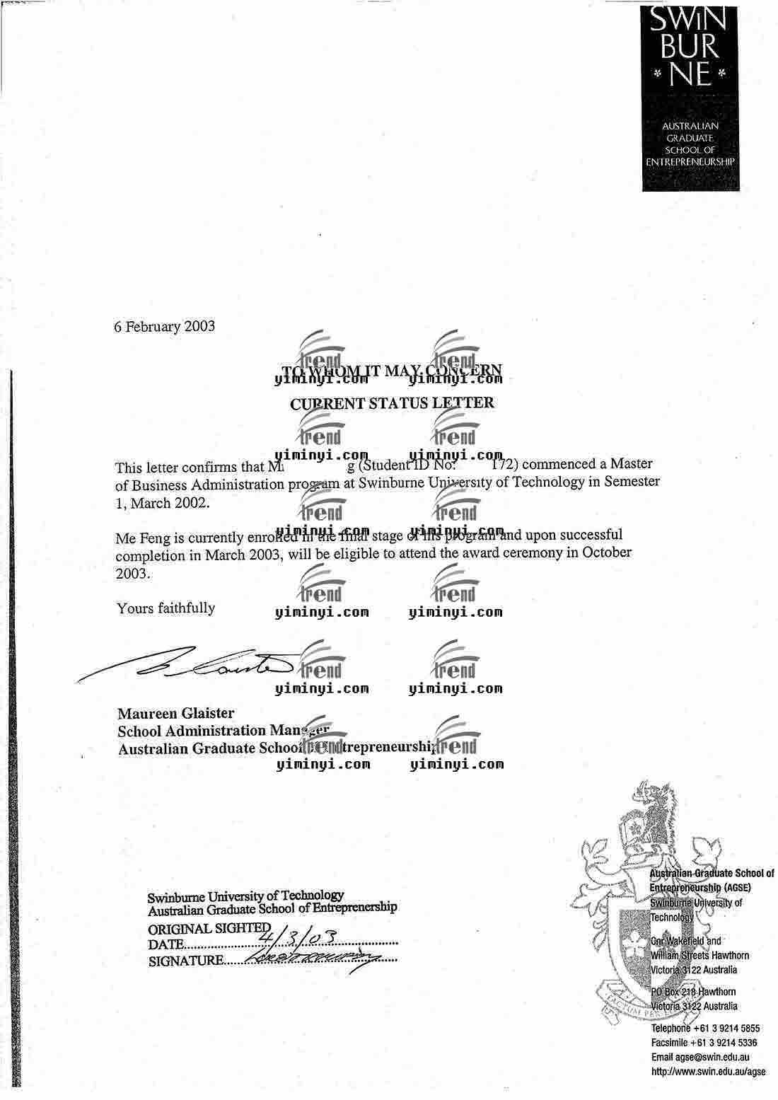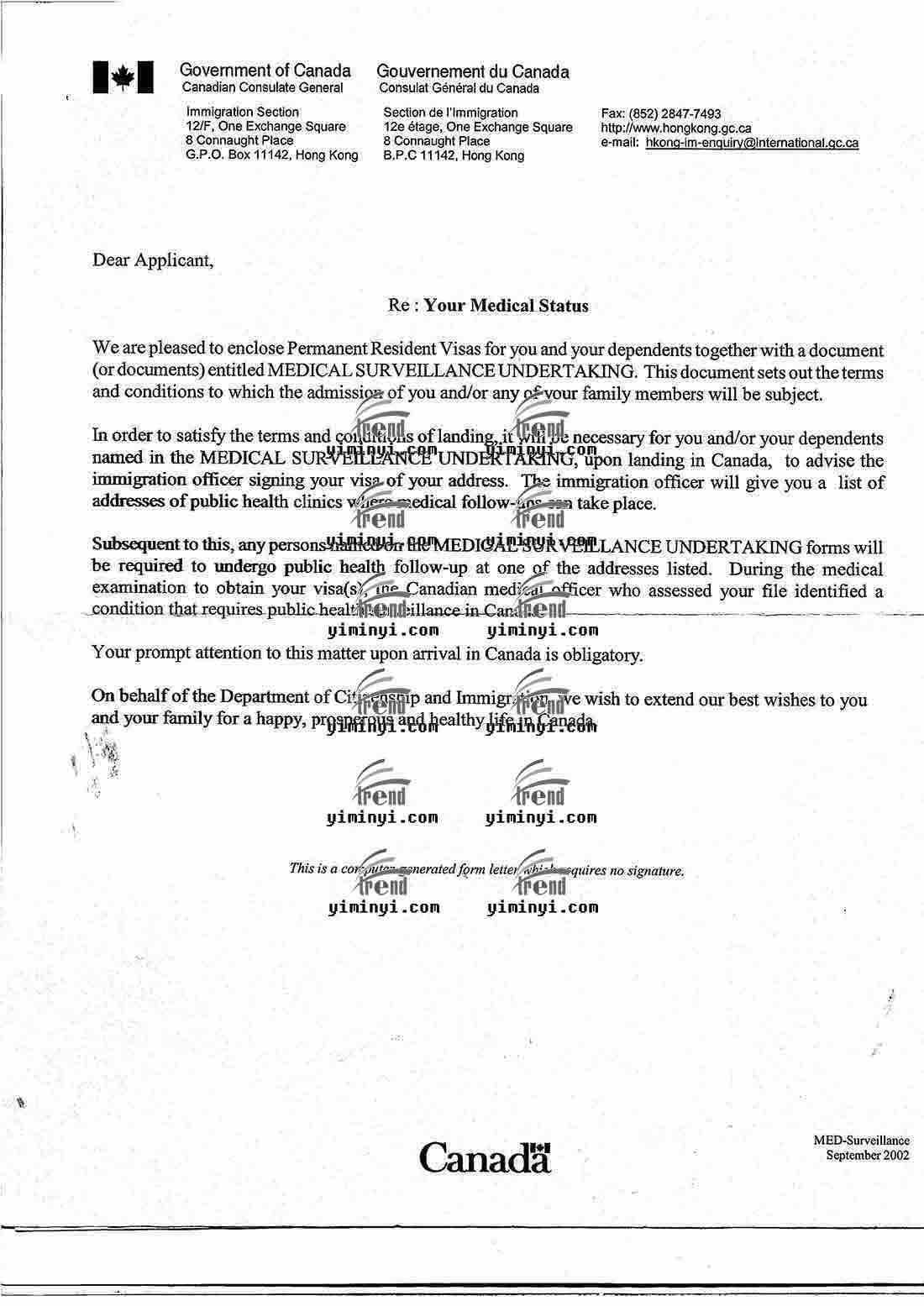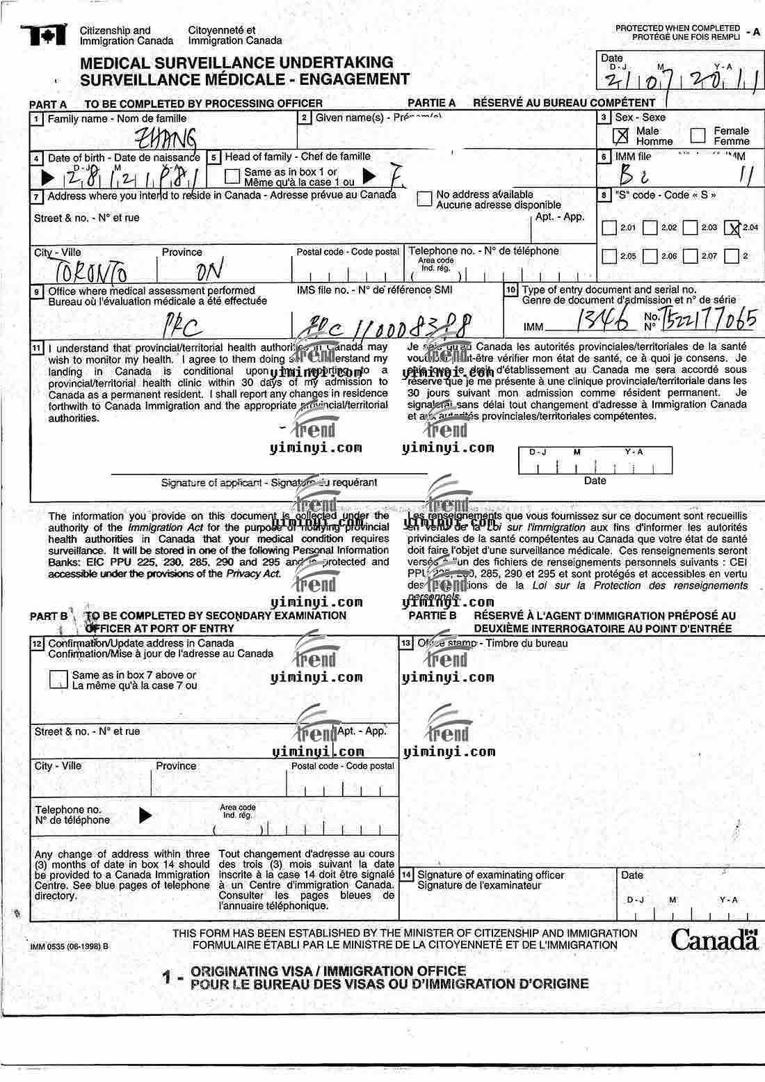冯先生,1973年出生,与张先生是同性,一起申请移民。冯先生是山东大学国际经济专业本科,后读的澳大利亚SWINBURNE UNIVERSITY OF TECHNOLOGY并获得MBA学位。毕业之后回国,在北京某跨国公司从事财务方面的工作。2008年9月自己递交了加拿大移民申请,但由于职业定位的问题,并没有申请成功。在2009年5月委托我们再次申请加拿大联邦技术移民,我们根据当时的移民政策详细的分析,感觉职业定位需要调整,按照当时的紧缺职业递交了所有的申请,在2009年7月递交了初步申请给CIO,9月收到了档案号码,然后递交完整的文件给加拿大香港领事馆。在2011年3月收到了香港领事馆的体检表,由于副申请人的健康问题再次做了体检。2011年下半年入境加拿大,成为了加拿大永久居民。。。。。。在此文件中,有第一次没有申请成功的档案号码,第二次我们给递交的档案号码,体检表,申请人在澳洲的学历背景和未刑证明等等。