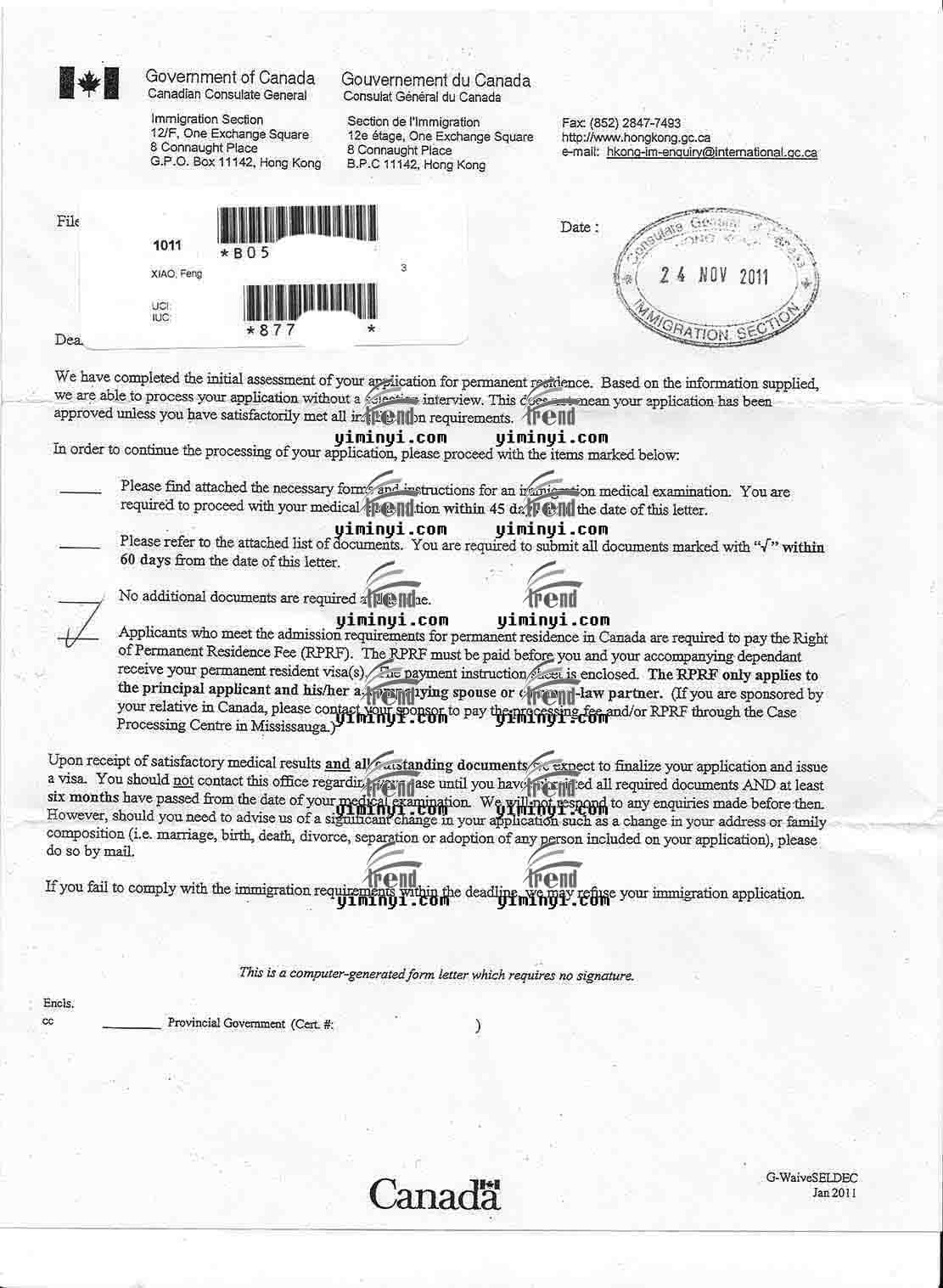 移民易出国网:加拿大联邦技术移民-使馆回复信件,肖女士,二年申请成功。