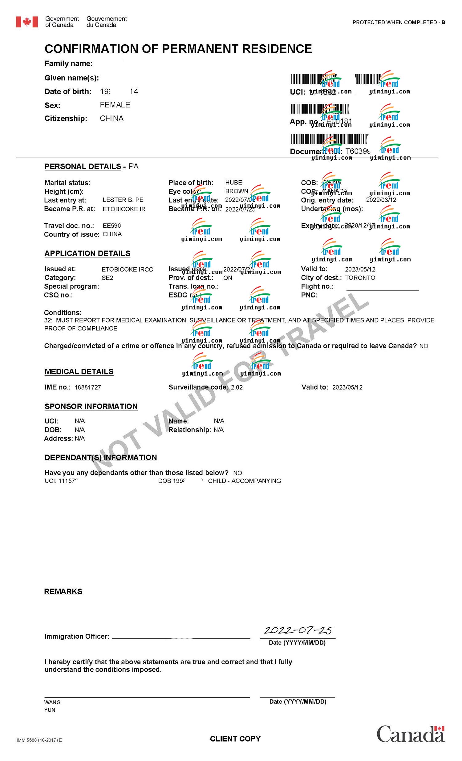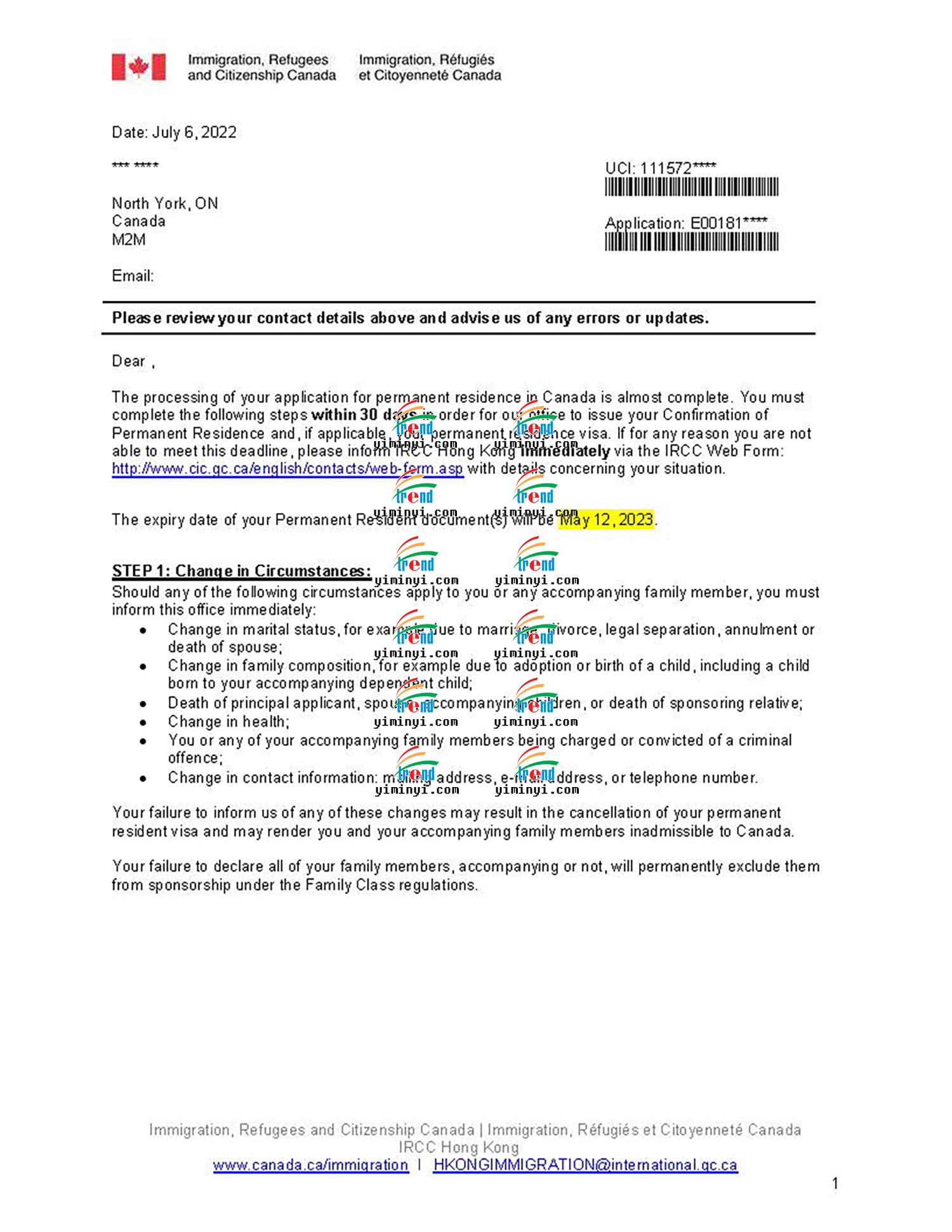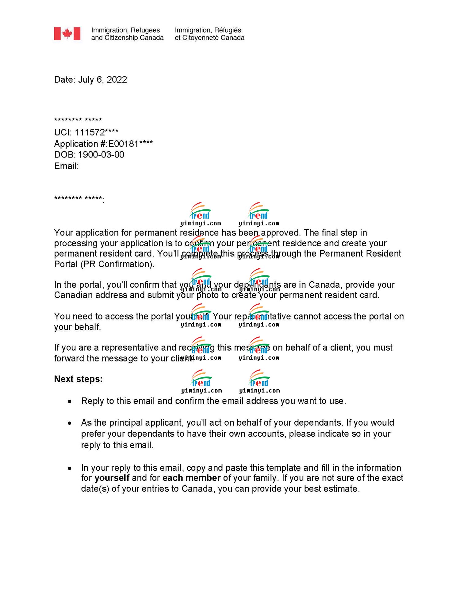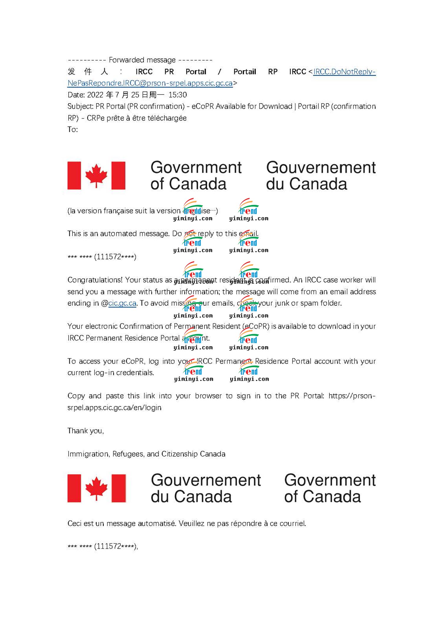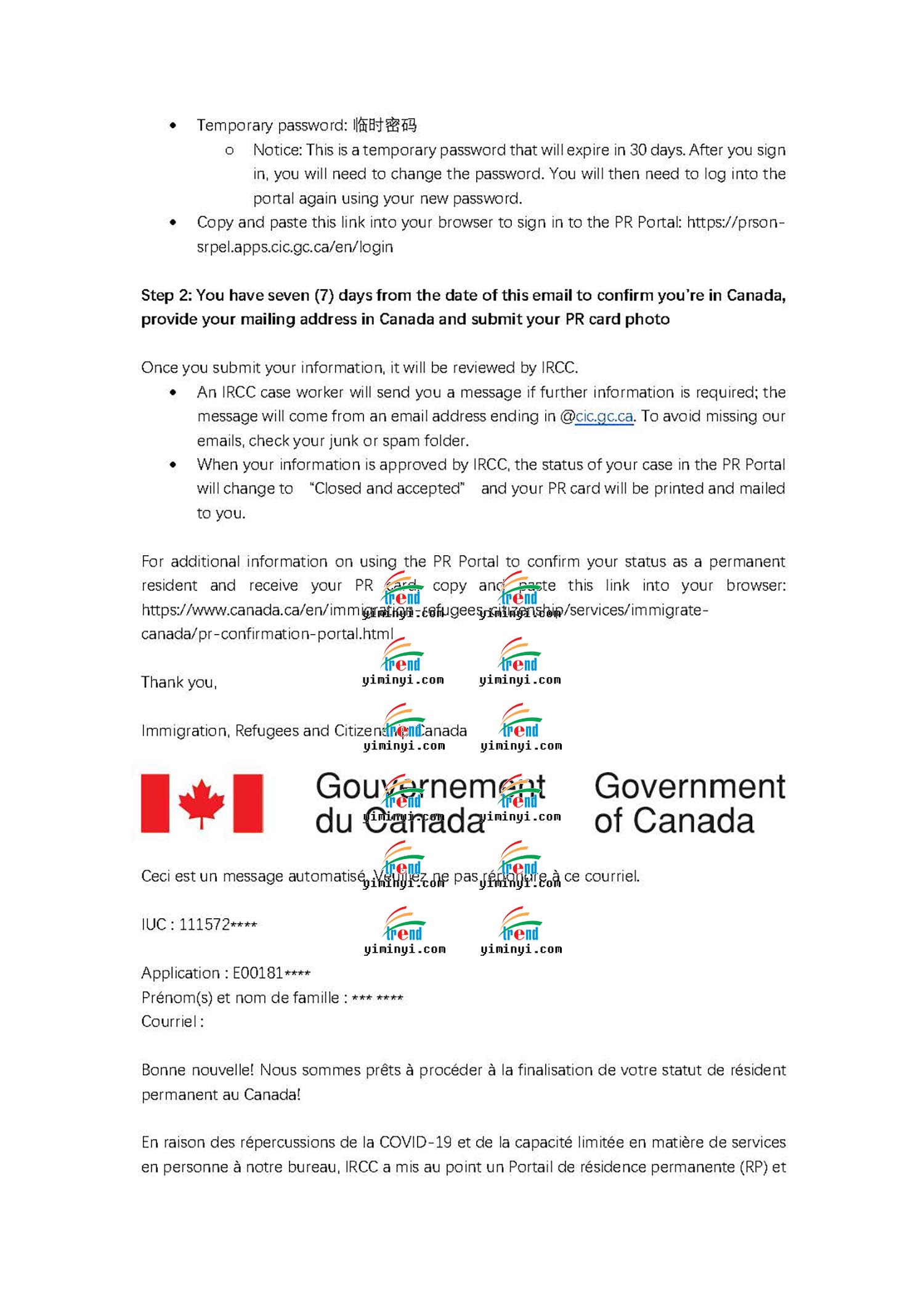 现在申请移民的程序随时都会变好,这次是主申请人在境内,移民部发送了一个PR PORTAL给客户,让客户自己登陆上去之后确认PR的身份。移民官会立刻处理并生成一份移民纸,让客户下载,同时移民部会在线处理枫叶卡的申请,大约几周就可以邮寄给客户了。