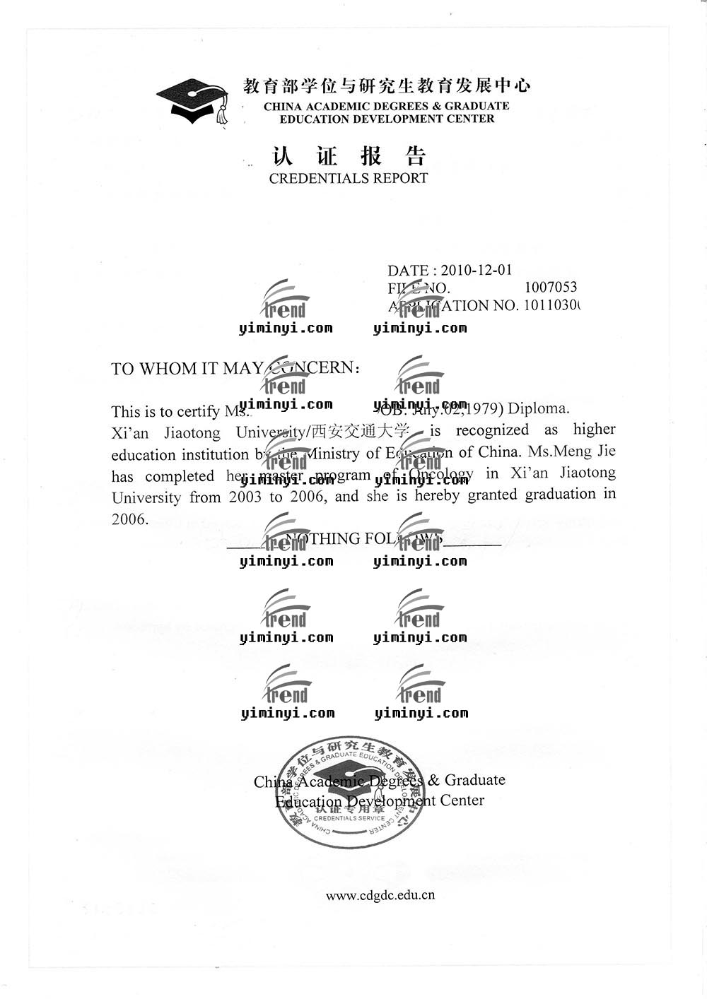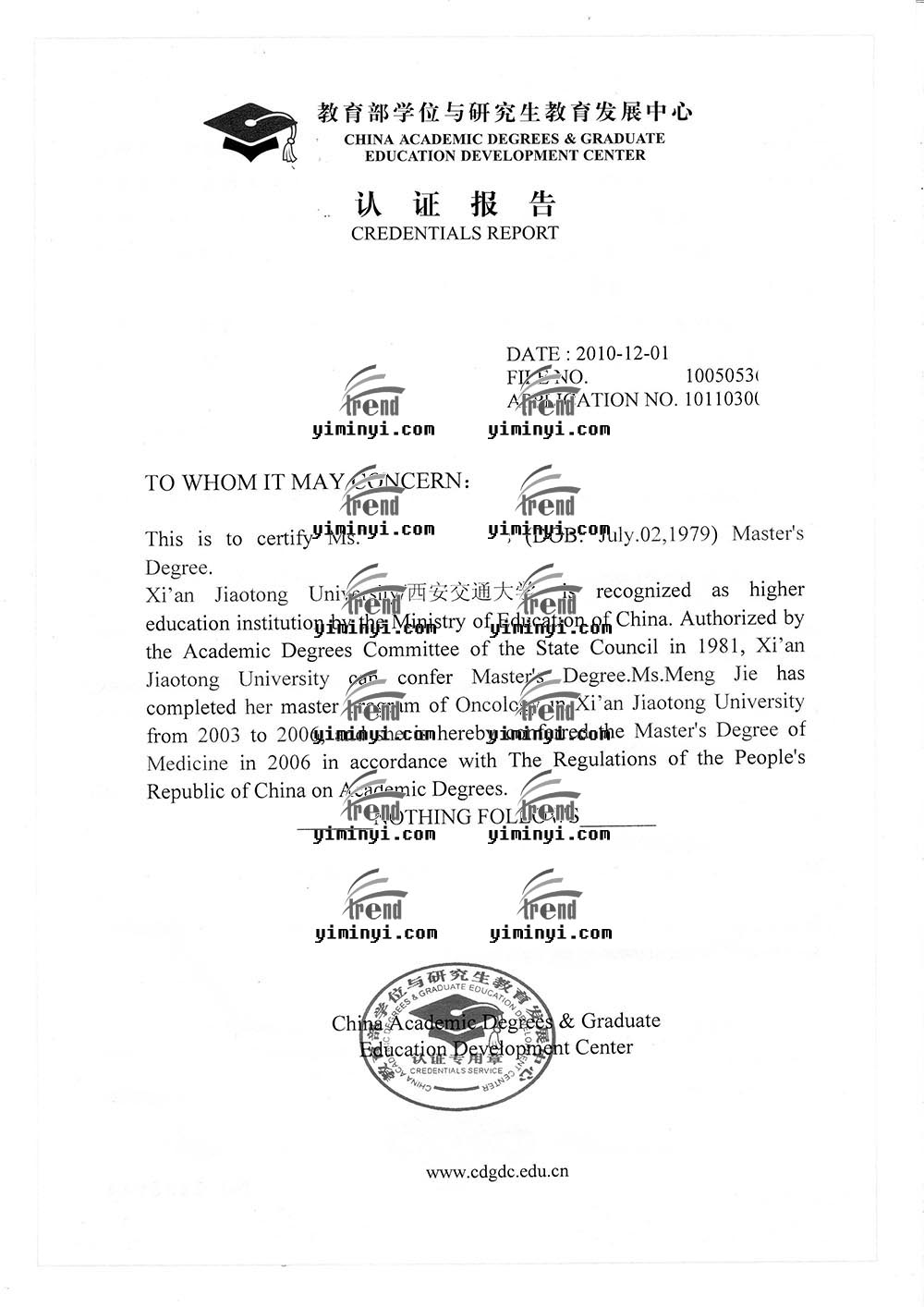 孟女士,1979年出生,一家三人。孟女士国内本科和研究生,专业是临床医学和肿瘤学,在国内三甲医院从事肿瘤科医生工作近10年,工作经验丰富,完全符合当时的加拿大移民政策。在2011年5月开始申请,7月得到的档案号码,之后顺利的通过体检并获得移民签证。文件中包括申请费汇票和学历认证,以及初审信等等。