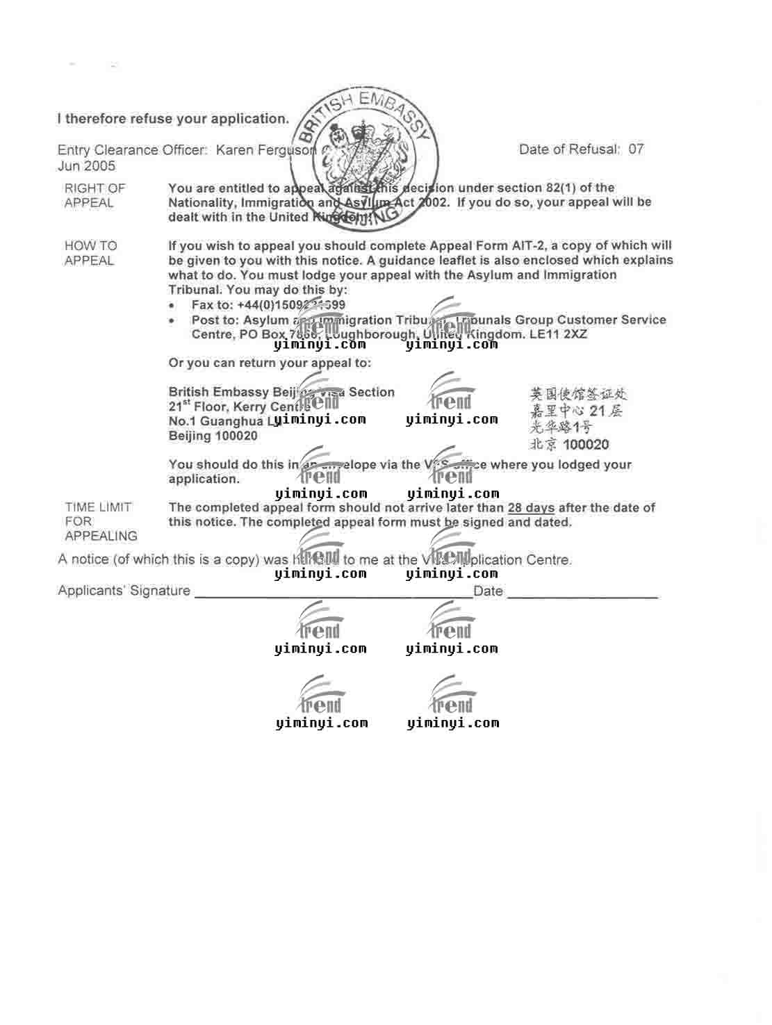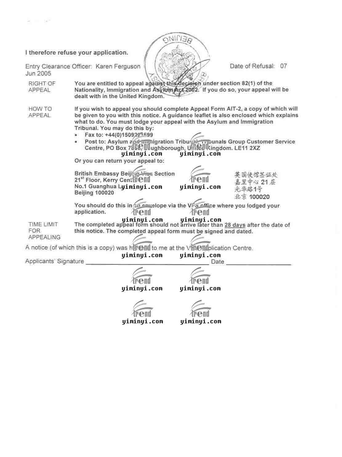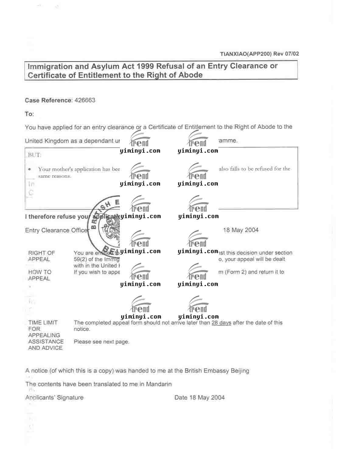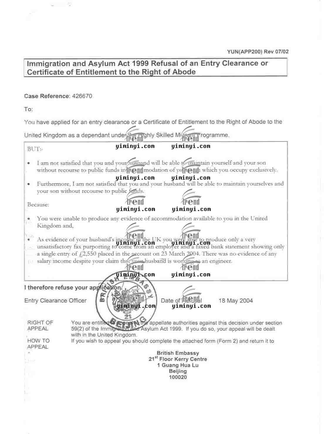 李女士,1964年出生,1999年委托某中介公司办理加拿大技术移民,并连续拒签二次,后来先生申请的英国高技术移民,并在2005年赴英国,后来办理了二次赴英国团聚移民,但也遭到拒签。2007年委托我们再次办理,我们经过仔细研究英国移民签证,在2007年7月成功为李女士申请成功,后在英国申请绿卡,具体的背景请看这个内容http://www.yiminyi.com/refuse4cases/。。。本文中,提供了某中介公司前后二次帮助申请加拿大技术移民,但没有成功的所有拒签记录,后申请英国拒签二次的拒签记录,以及我们第五次为该客户申请英国高技术移民的签证。。。。。。