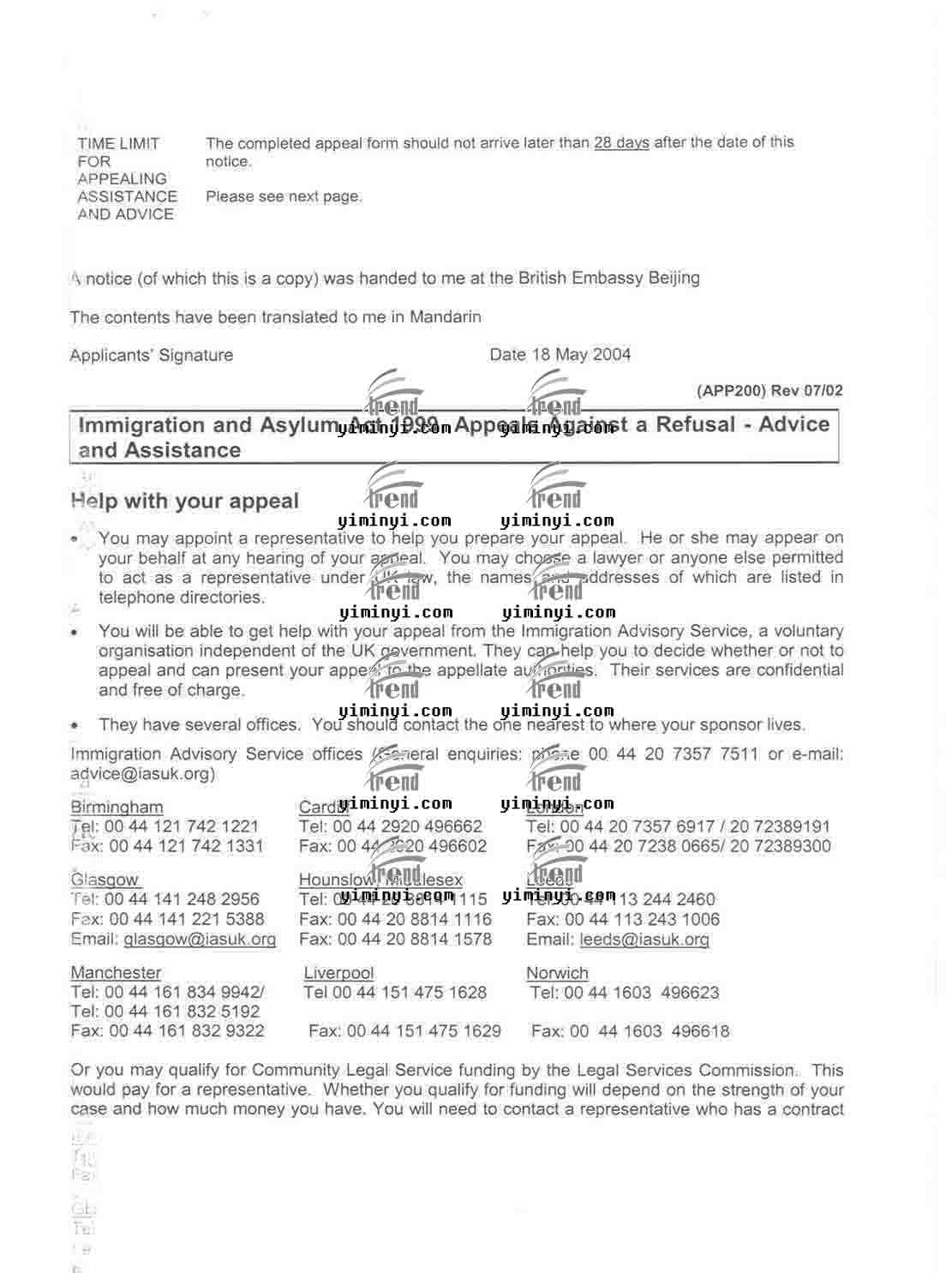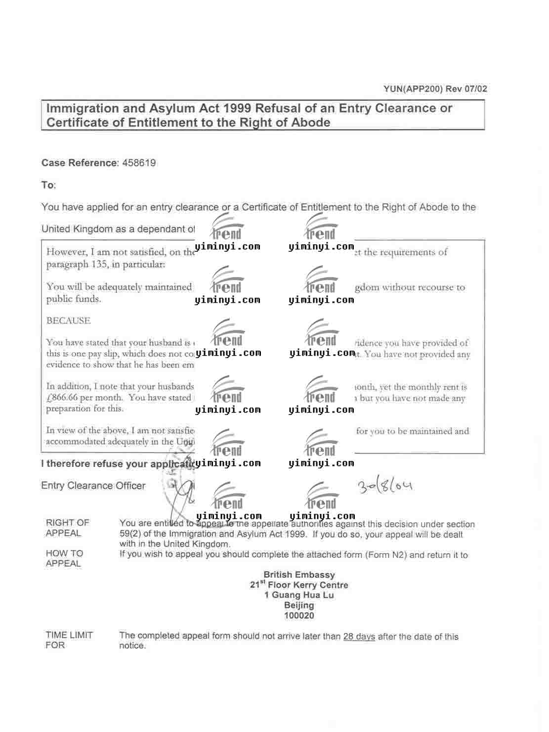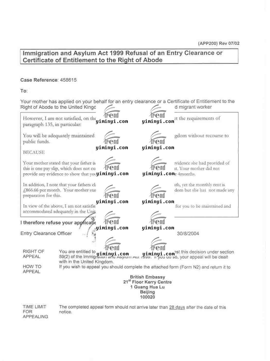 李女士,1964年出生,1999年委托某中介公司办理加拿大技术移民,并连续拒签二次,后来先生申请的英国高技术移民,并在2005年赴英国,后来办理了二次赴英国团聚移民,但也遭到拒签。2007年委托我们再次办理,我们经过仔细研究英国移民签证,在2007年7月成功为李女士申请成功,后在英国申请绿卡,具体的背景请看这个内容http://www.yiminyi.com/refuse4cases/。。。本文中,提供了某中介公司前后二次帮助申请加拿大技术移民,但没有成功的所有拒签记录,后申请英国拒签二次的拒签记录,以及我们第五次为该客户申请英国高技术移民的签证。。。。。。