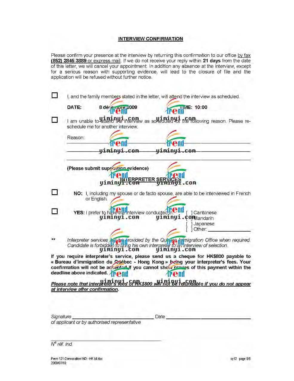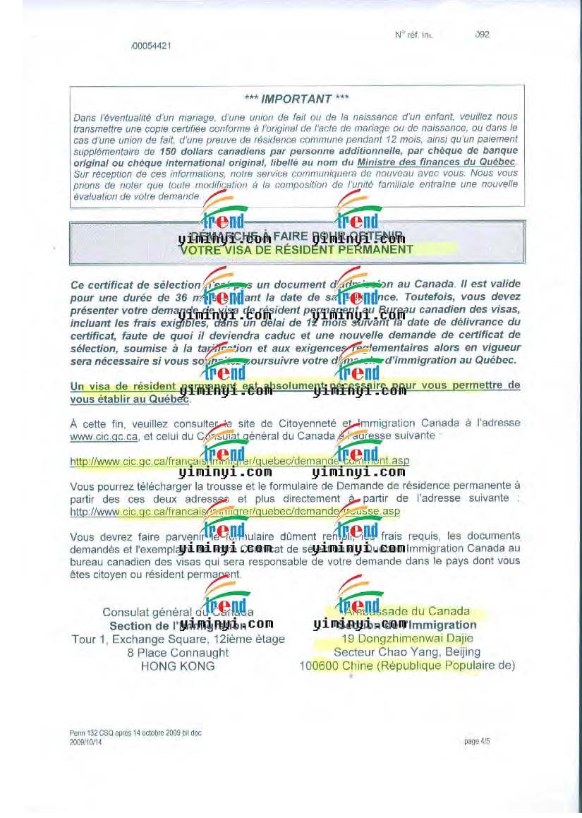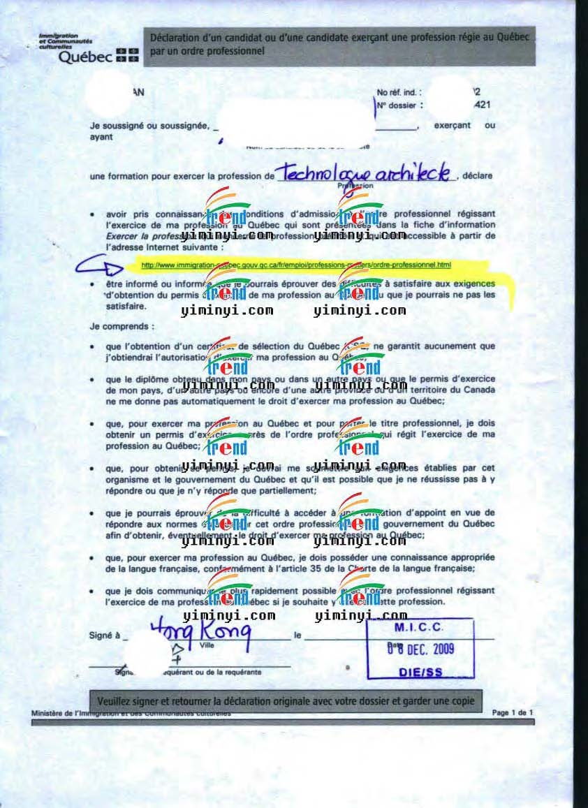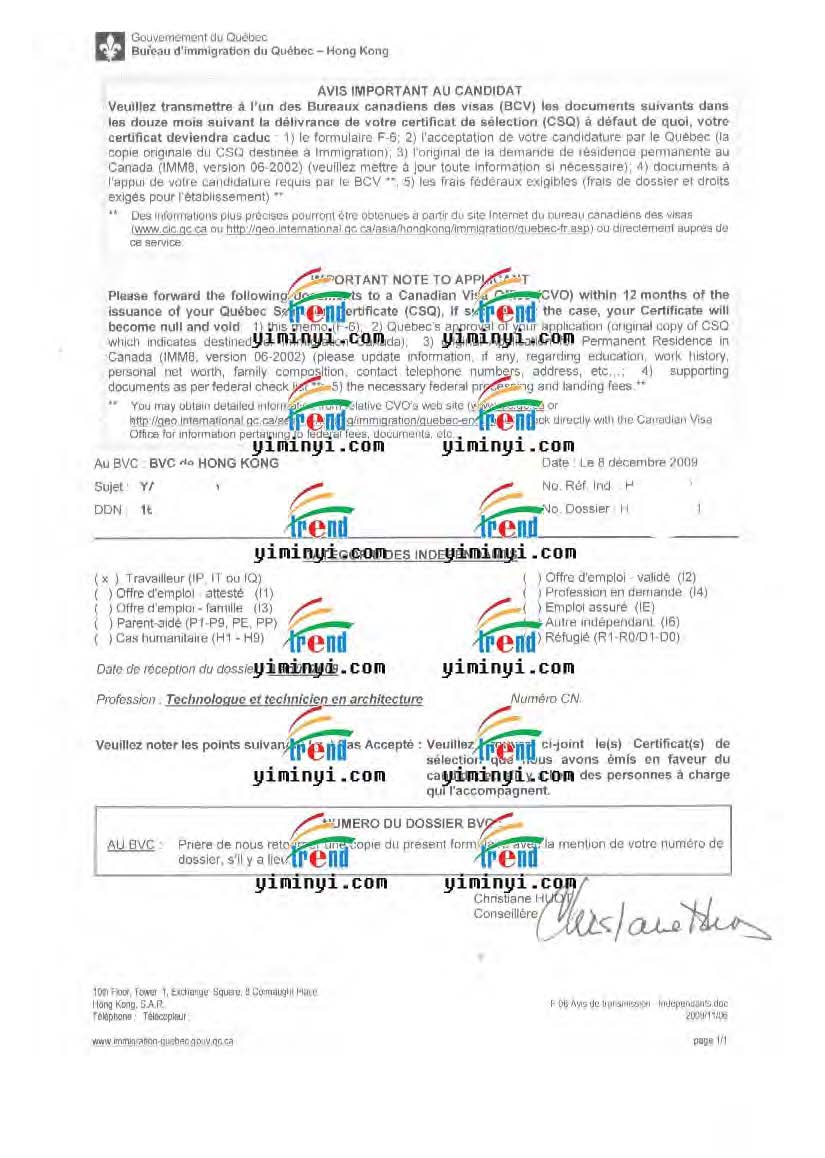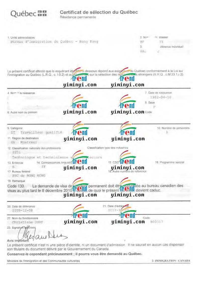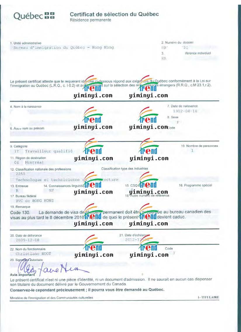 颜女士,佛山科学技术学院的园艺专业本科毕业,2005年大学毕业后,在广东省某设计研究院任职建筑师和绘图技术员工作,2008年12月开始申请魁省技术移民,我们先整理好材料之后递交魁省在香港的办事处,然后收到了档案号码信,后来补充上一部分法语培训课程之后,收到了面试信。在香港办事处面试非常的成功,当场就发了魁省甄选证书。然后我们帮助办理联邦移民签证,在2010年4月成功收到了加拿大移民的签证。