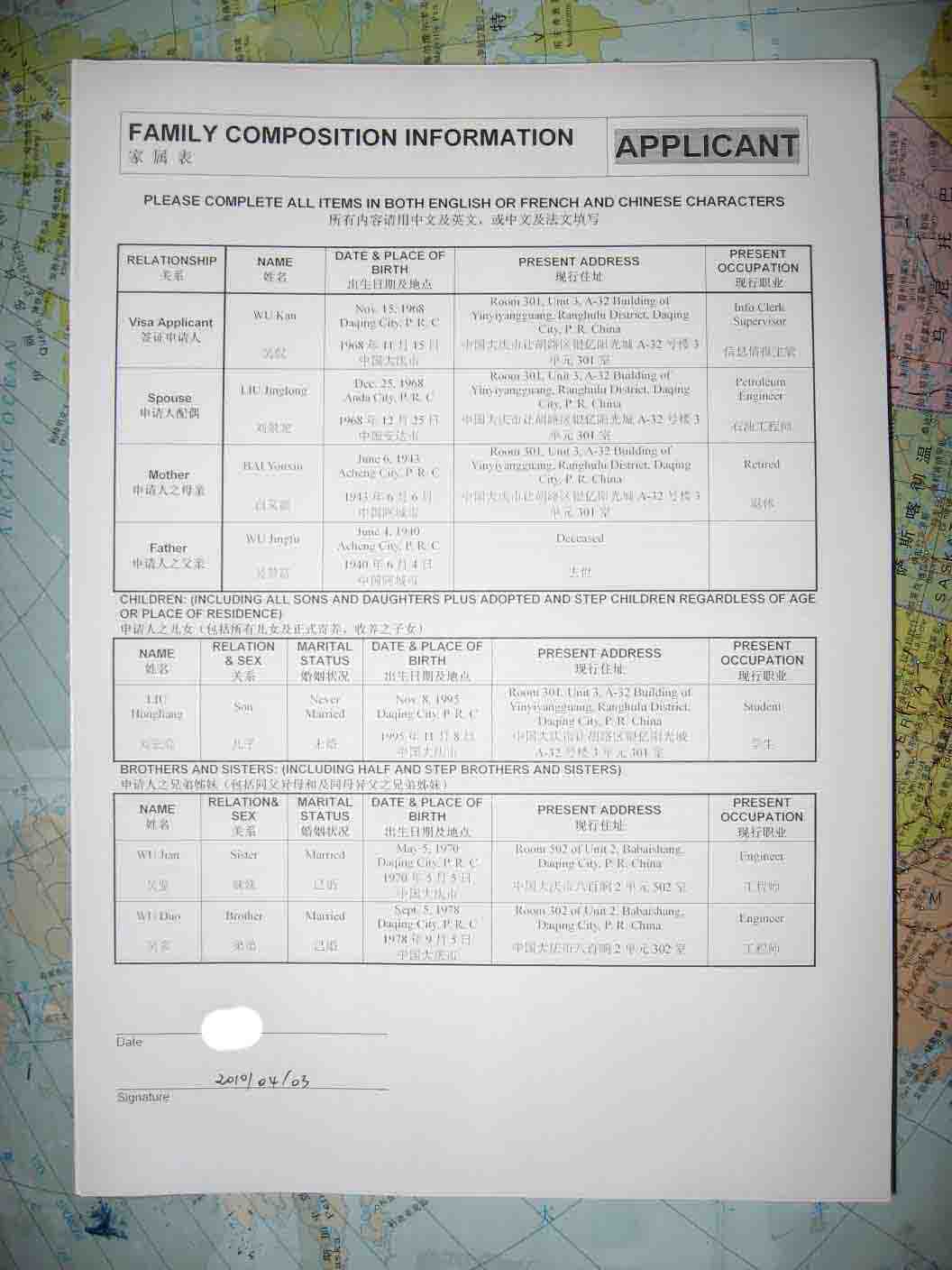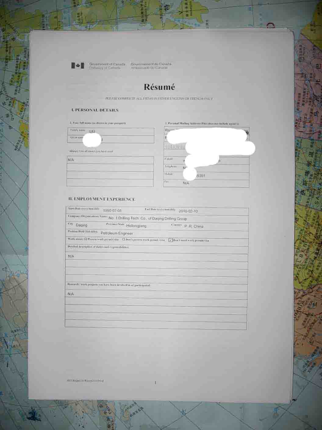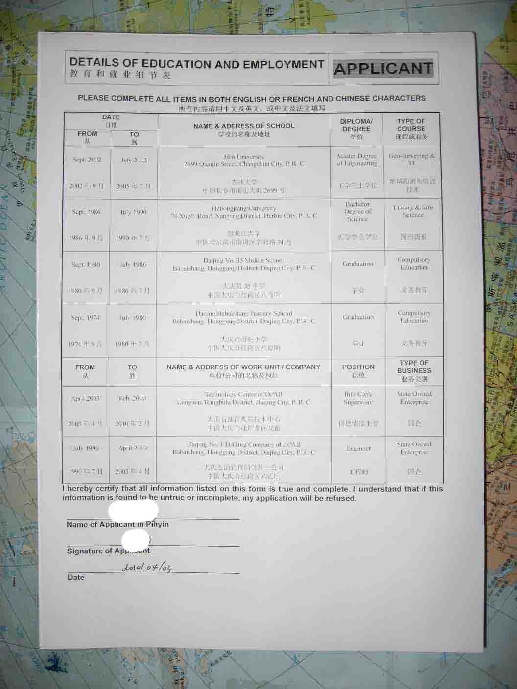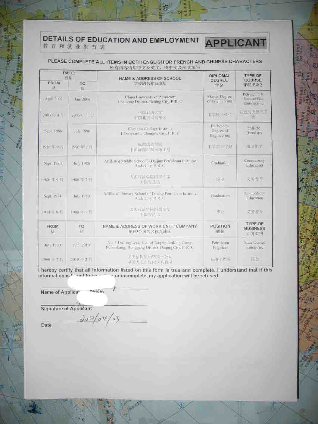 吴女士,1968年出生,1986-1990年黑龙江大学就读,专业是图书情报学,获得学士学位。2002-2005年在吉林大学就读,专业是地球探测与信息技术,获得硕士学位。本人一直在大型国企从事工程师和高级工程师。在2010年3月正式递交了加拿大移民的申请,在2年之后获得移民签证。。。在本文中,我们提供了申请移民的所有的文件。。。。。。