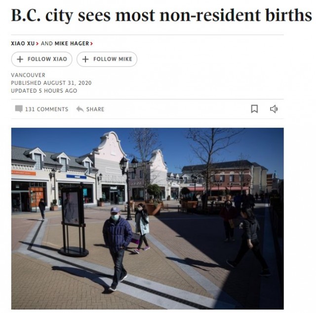 据 theglobeandmail报道,与前一年相比,2019年加拿大非永久居民妇女分娩增加了300例,其中包括留学生、工签者与游客。加拿大卫生信息研究所的统计数据显示,卑诗省列治文市非居民出生婴儿达到502例,即每4名婴儿就有1名是非居民婴儿。