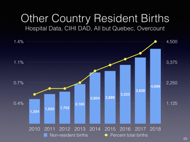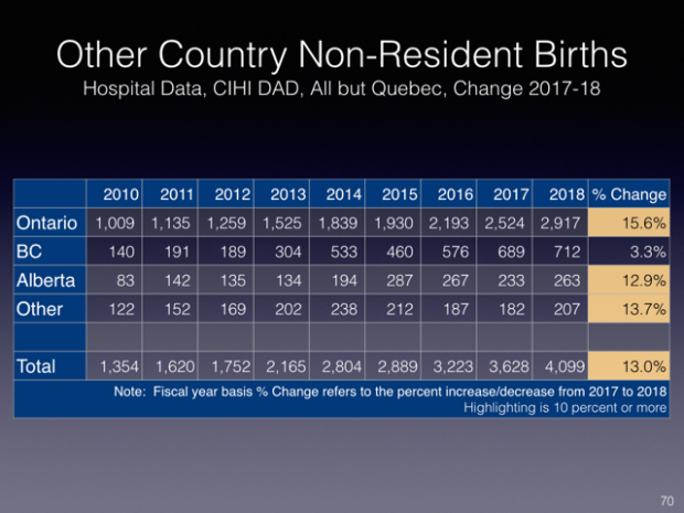 加拿大全球事务研究所(Canadian Globla Affairs Institute)的研究员Andrew Griffith表示:生育旅游的成长率比移民人口增长率更快,也超过加拿大总体人口增长率。Andrew Griffith的研究显示,从2008年到2018年,双非婴的出生率稳步上升,但过去一年却暴增13%,绝大多数出生在安省。2010年有1,354名双非婴出生,截至2019年3月的12个月内有4,099名,占加拿大所有出生婴儿1.4%。