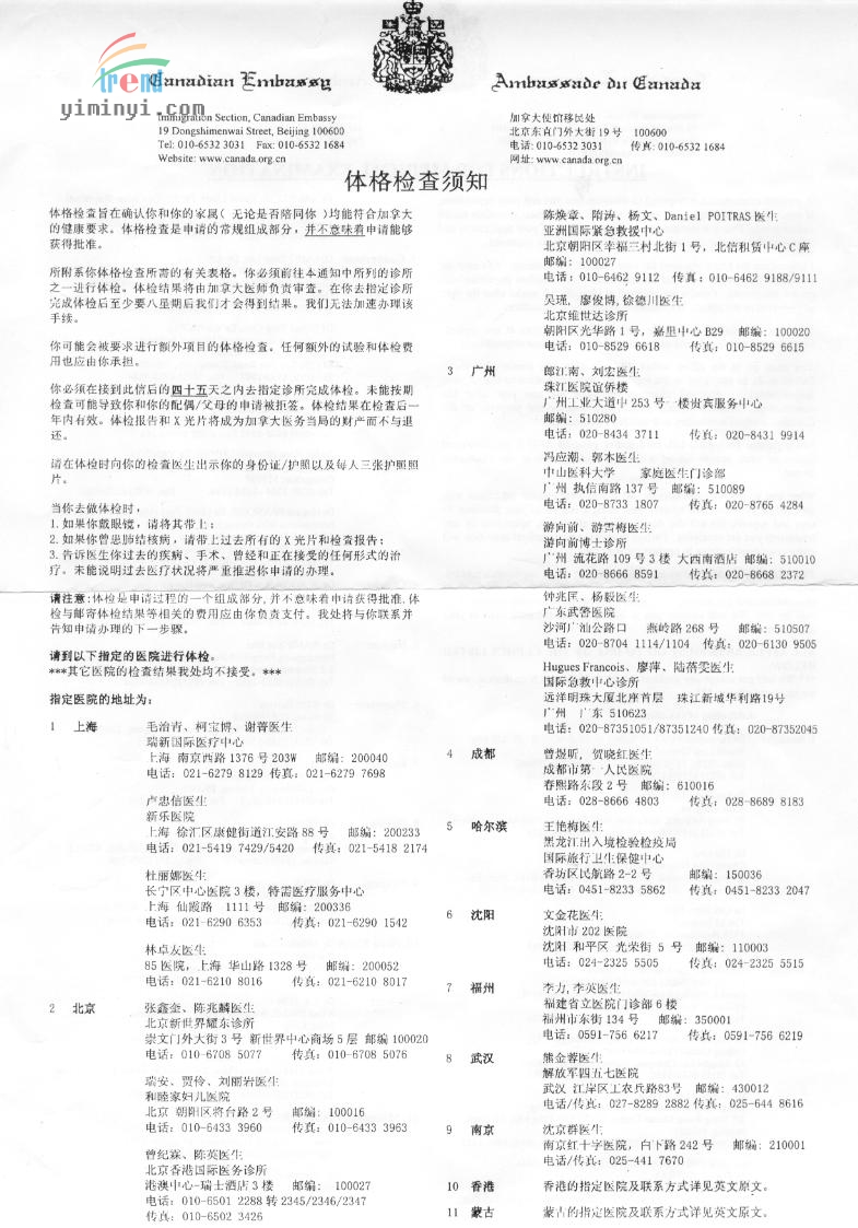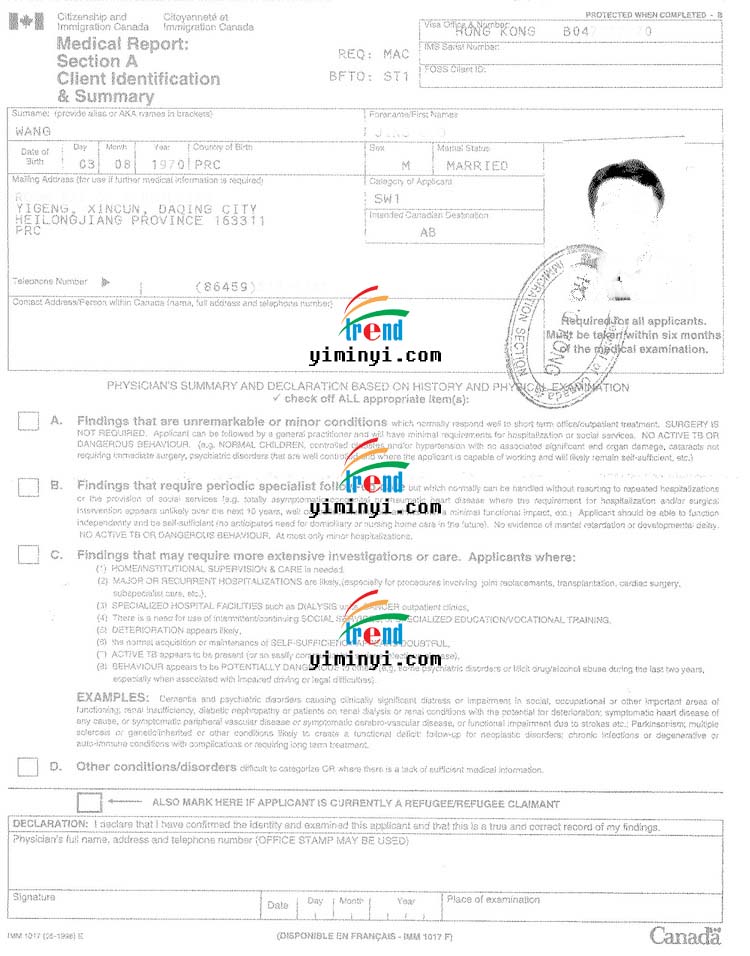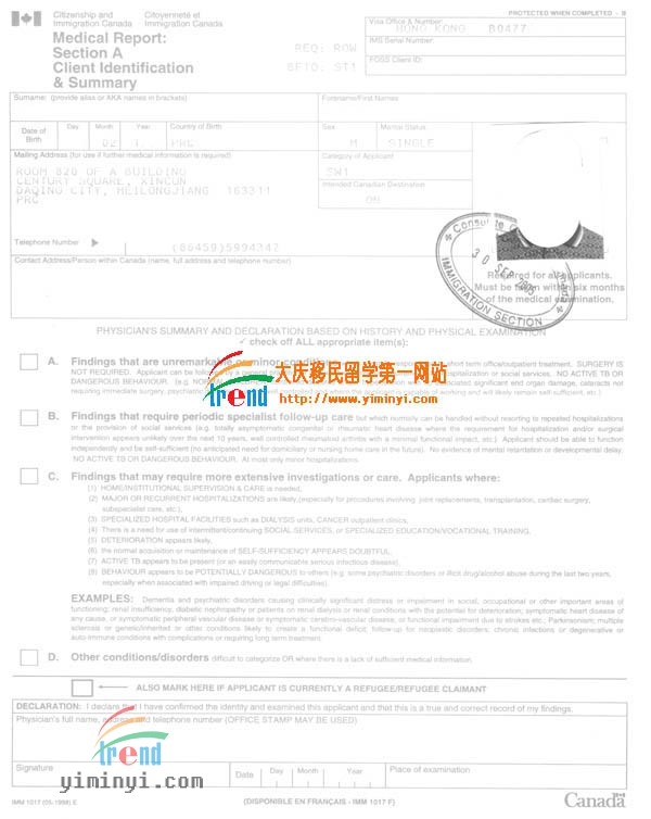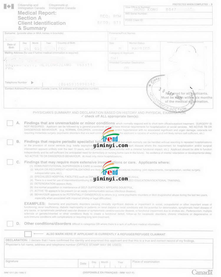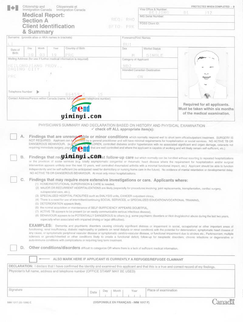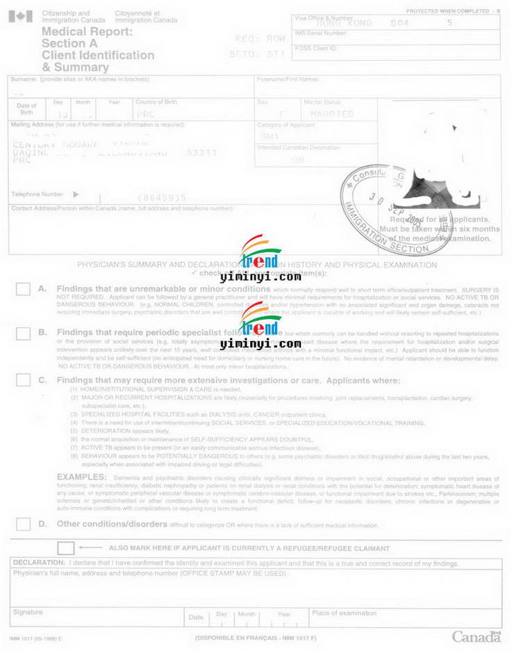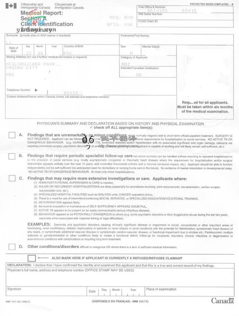 这些事1999年至2005年期间,部分客户的体检表,这个期间的加拿大移民体检,是由北京大使馆或香港领事馆邮寄体检表格,客户拿着体检表格去指定的医院体检。