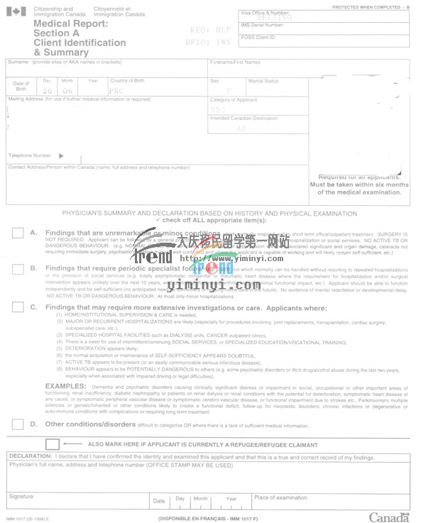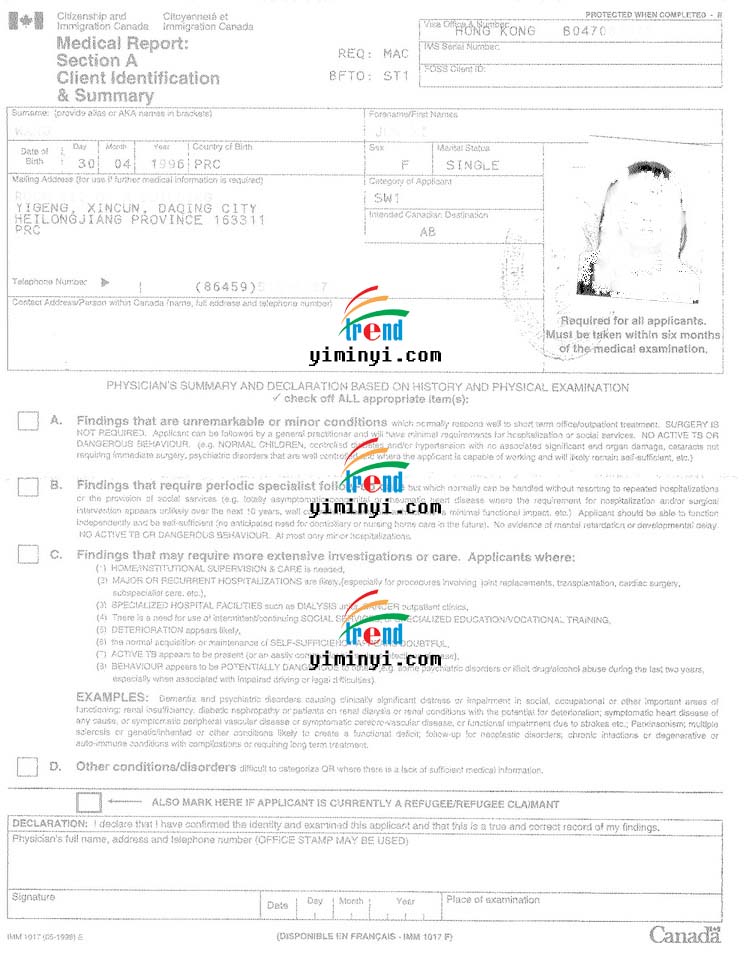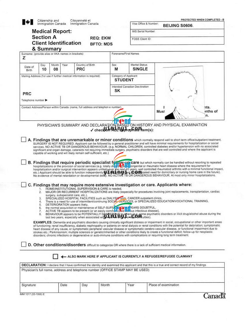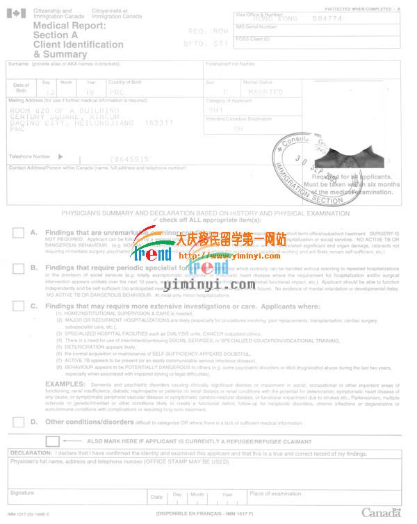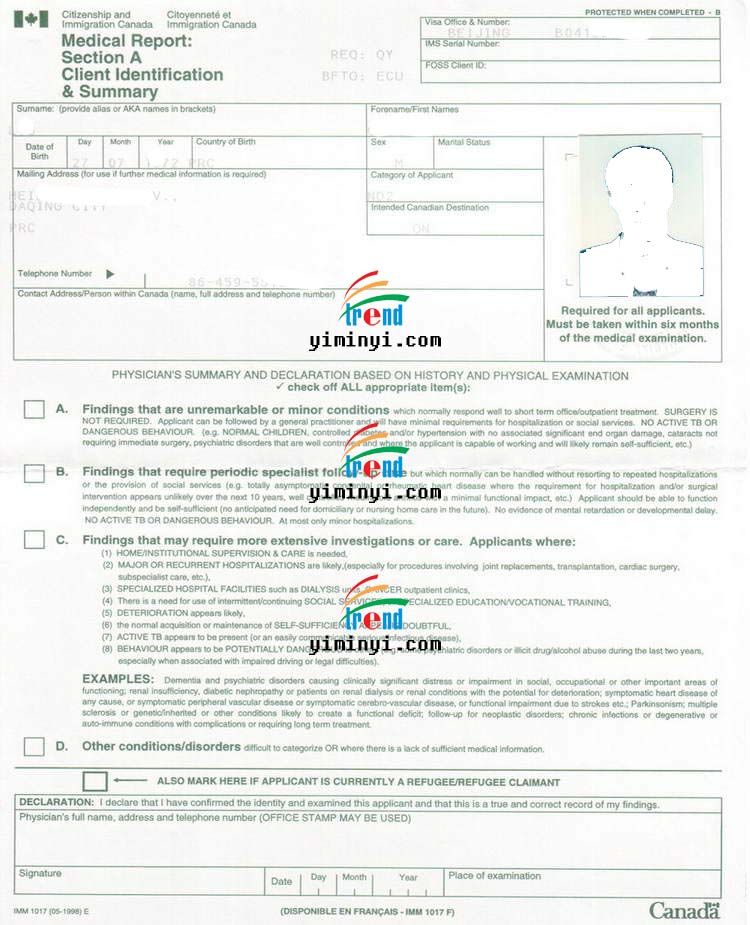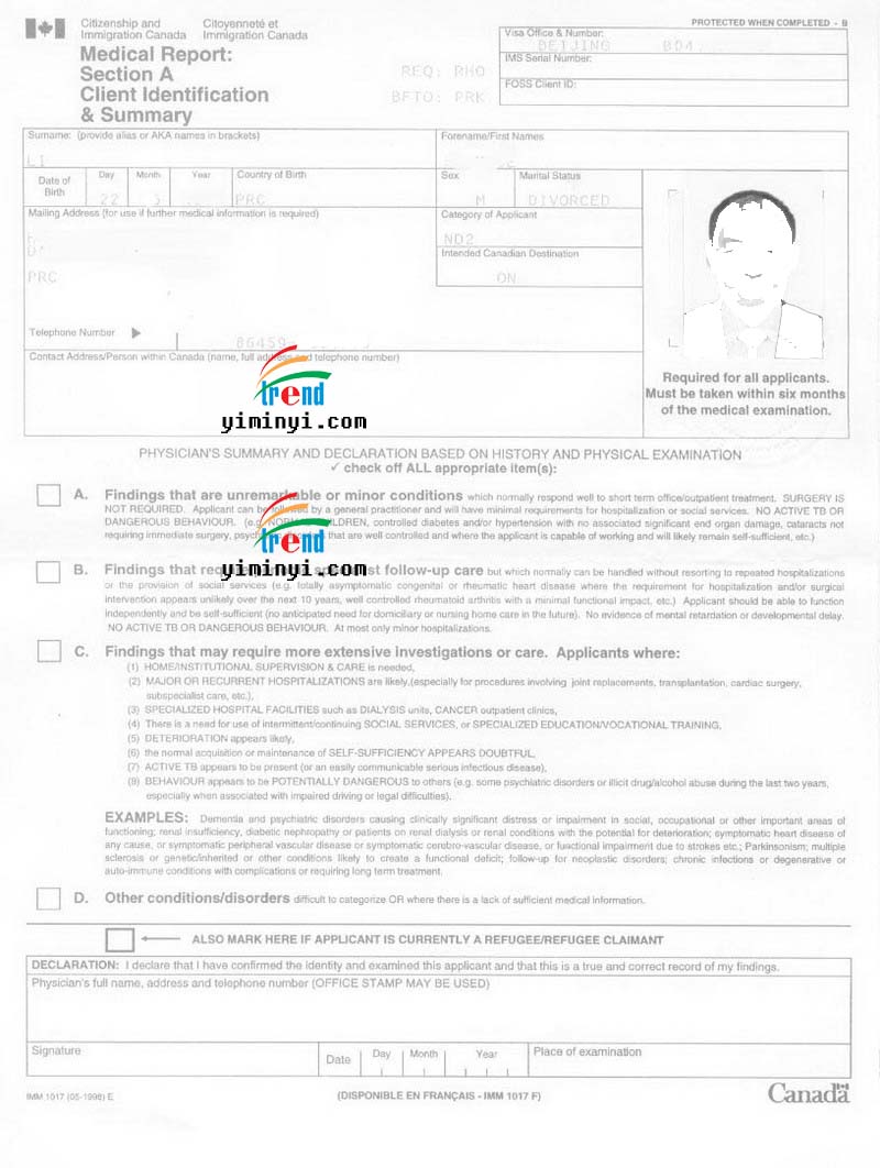 这些事1999年至2005年期间,部分客户的体检表,这个期间的加拿大移民体检,是由北京大使馆或香港领事馆邮寄体检表格,客户拿着体检表格去指定的医院体检。