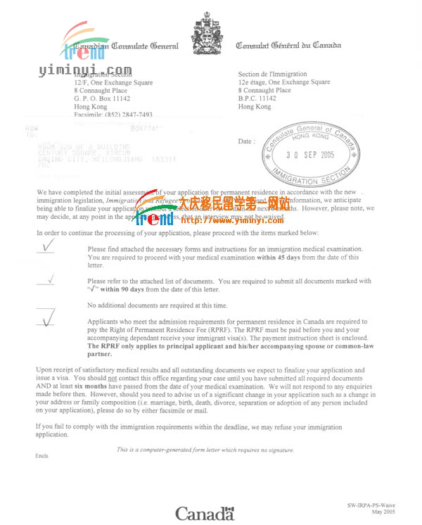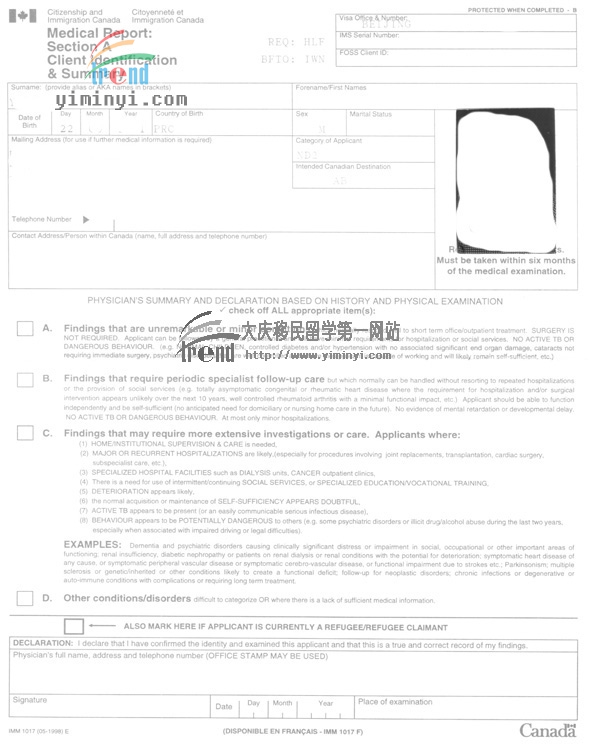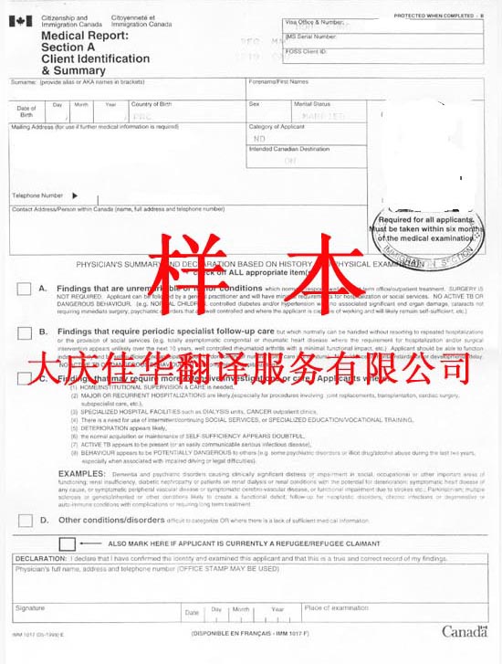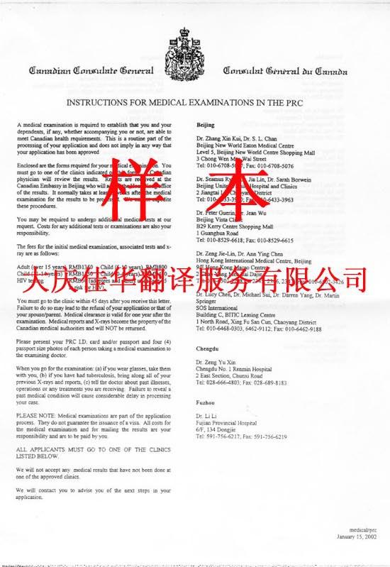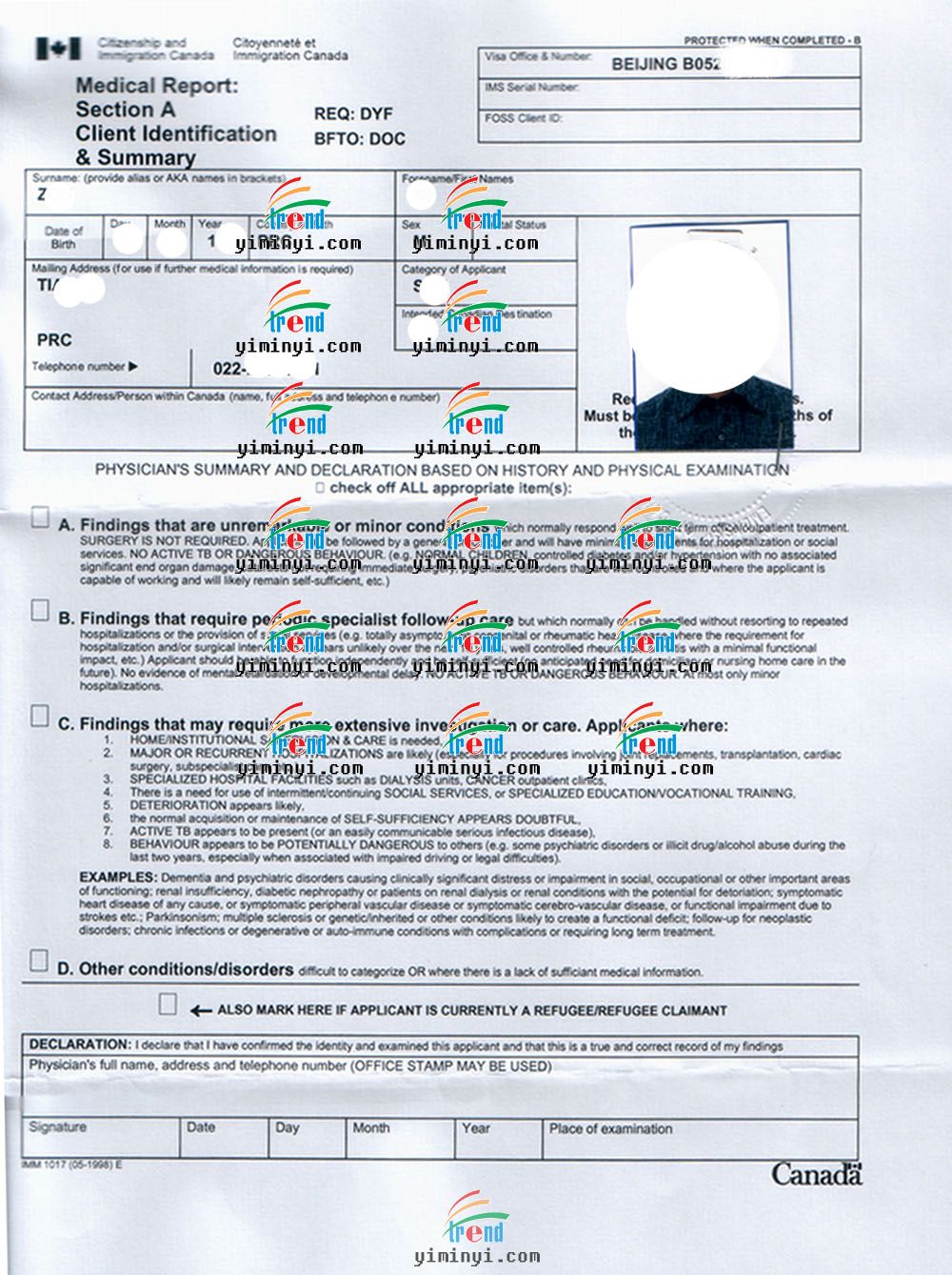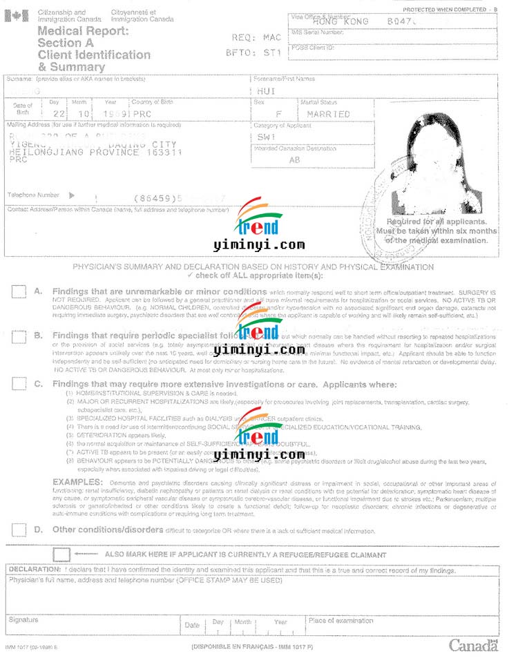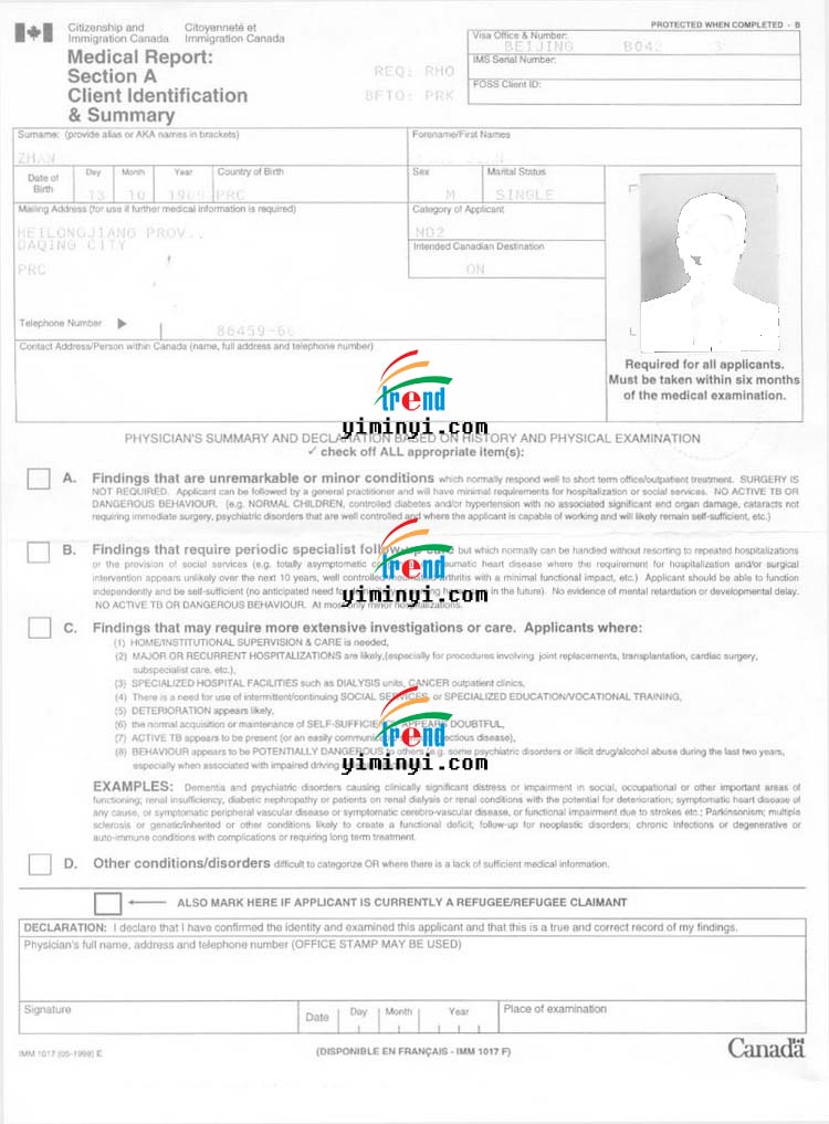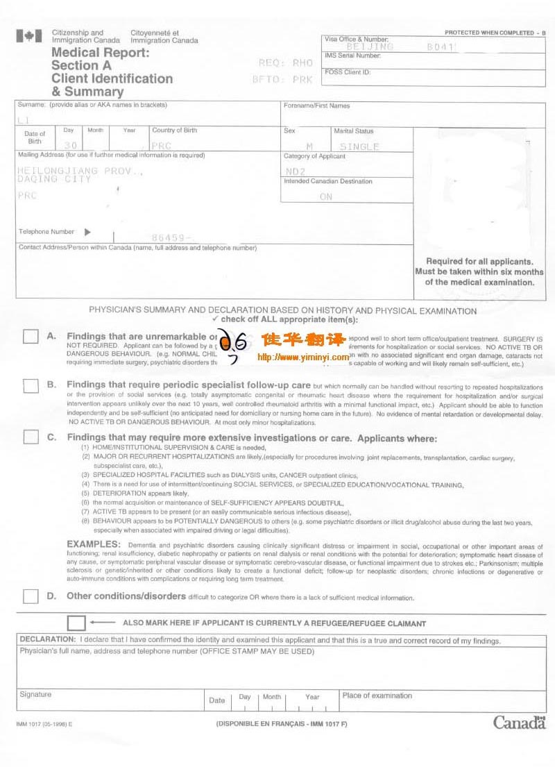 这些事1999年至2005年期间,部分客户的体检表,这个期间的加拿大移民体检,是由北京大使馆或香港领事馆邮寄体检表格,客户拿着体检表格去指定的医院体检。